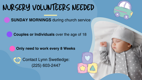 If you have any questions about volunteering or anything nursery related, contact our Nursery Coordinator, Lynn Swetledge (225) 603-2447.